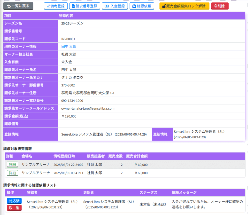 請求情報は「請求時点のオーナー情報」で作成されます。そのため、請求先の個人情報と現在管理されている情報が異なる可能性があるため、ご注意ください。