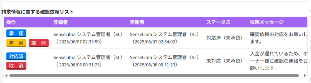 確認依頼は請求詳細情報の下部に表示され、確認依頼のステータスにより操作ボタンが表示されるため必要な操作を行ってください。